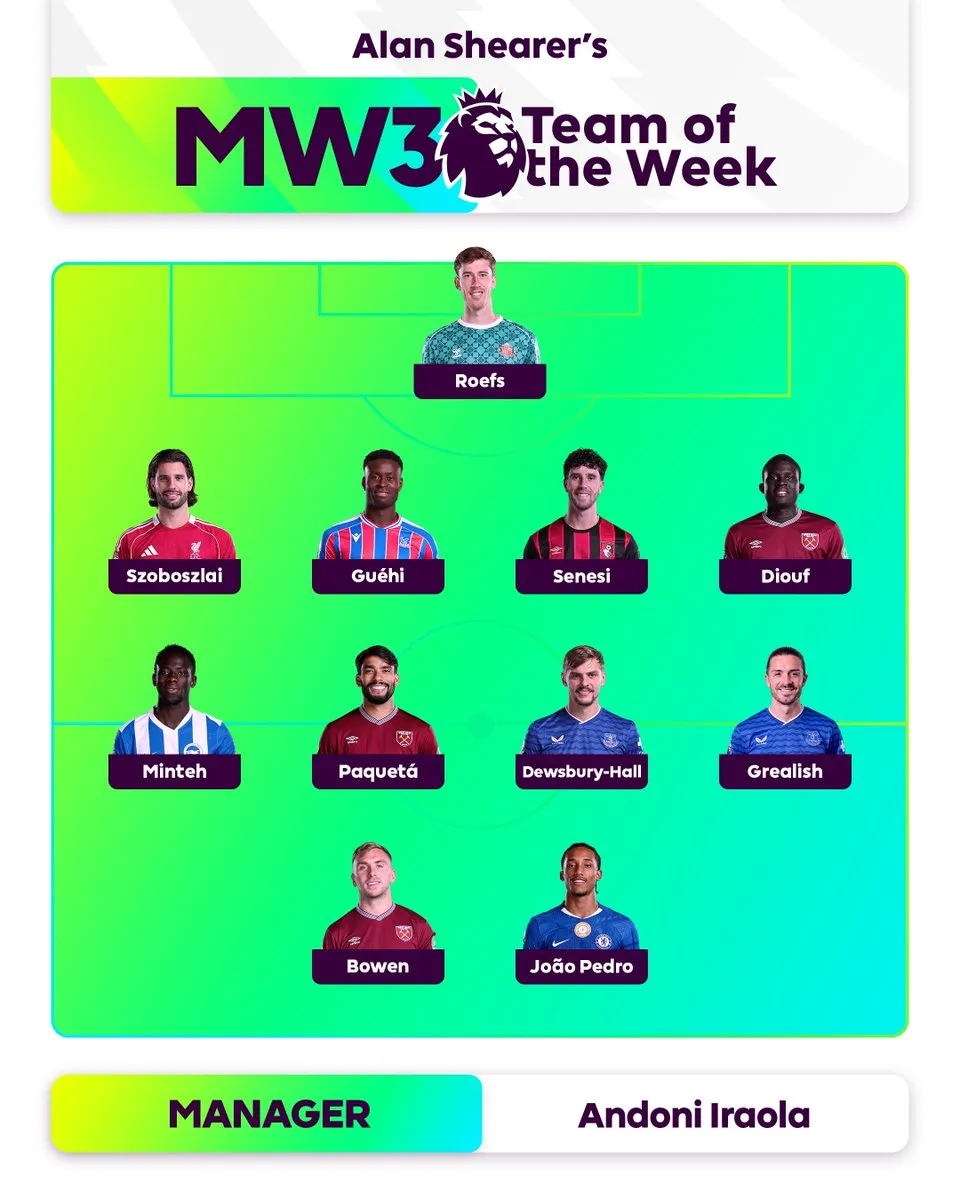 虎扑09月03日讯 英超官方公布了阿兰-希勒评选的联赛第3轮最佳阵容,鲍文、佩德罗领衔锋线,格拉利什、索博斯洛伊等在列。